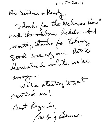 "Just wanted you to know that everything looks great and I appreciate your excellent care of this place all summer! Thanks for dealing with the car charger. To be honest, I am not comfortable doing it - so thanks! I hope you have a wonderful winter and I hope to contact you again next spring. It’s great to be back!"