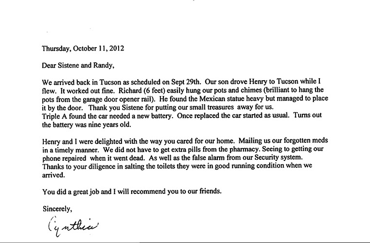 "We have returned to Tucson today.  The house looks great.  Thank you very much for taking care of it.  You are a great service."