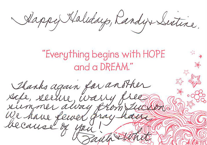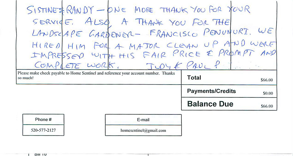 "Wow, you are the gift that keeps on giving. Thank heavens you were there when Tucson Water was there for our water leak.  Thanks so much for your diligence!  Thanks so much for all you guys do to go above and beyond the care of our place."
