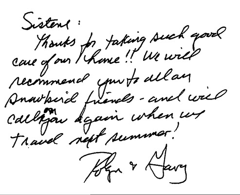 "Just wanted you to know that everything looks great and I appreciate your excellent care of this place all summer!  Thanks for dealing with the car charger.  To be honest, I am not comfortable doing it - so thanks!  I hope you have a wonderful winter and I hope to contact you again next spring.  It’s great to be back!"